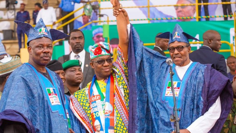 However, the president's next action, an unavoidable campaign rally ritual, was to raise Abiodun's hand as endorsement of his candidacy as the party's flag bearer.